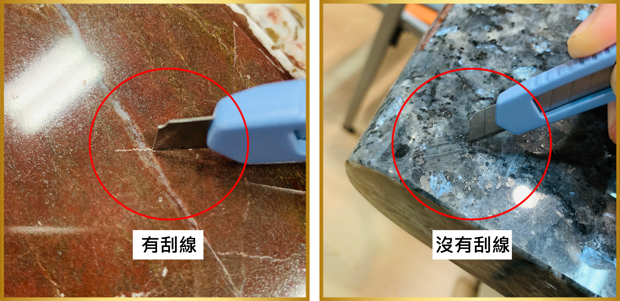 ● 劃不下去,沒有刮痕:「天然花崗石」或「人造石英石」