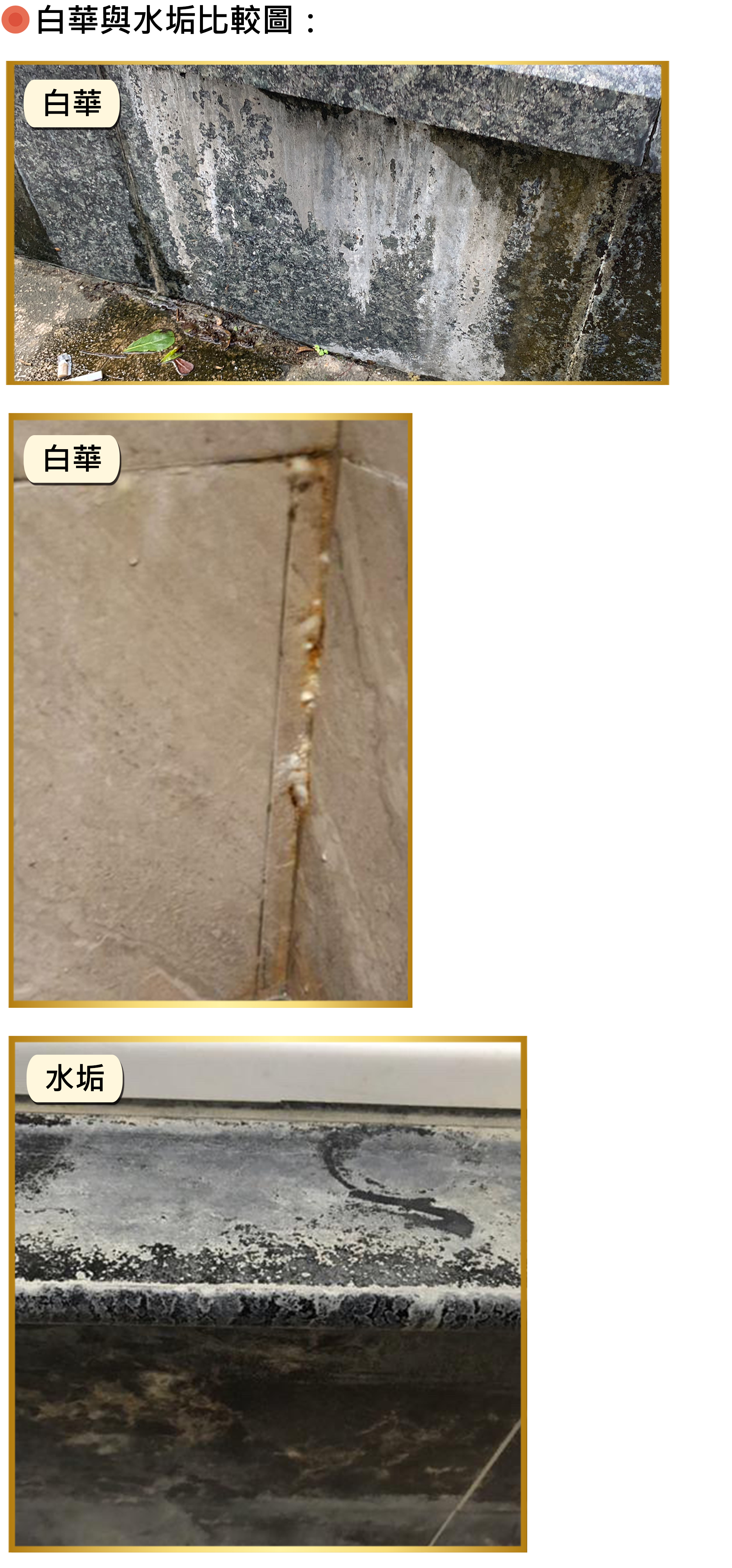 白華與水皂垢不同。白華的成因,是因為黏貼石材的背貼水泥漿中所溶離出的氫氧化鈣,滲透到石材表面或從填縫處、裂縫處滲透出來,而這些氫氧化鈣再和空氣濕氣或雨水中的二氧化碳進行碳酸化合物反應後,形成硫酸鈣或碳酸鈣,且當水份蒸發後,就會析出白色結晶物。(小編:太多化學名詞了,不用背啦!簡單來說,就是類似鐘乳石的概念)