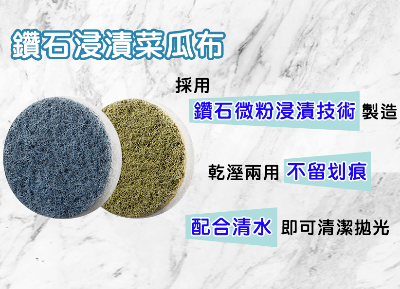 (1) 除汙清潔:"藍色"鑽石浸漬菜瓜布,搭配清水清潔面層