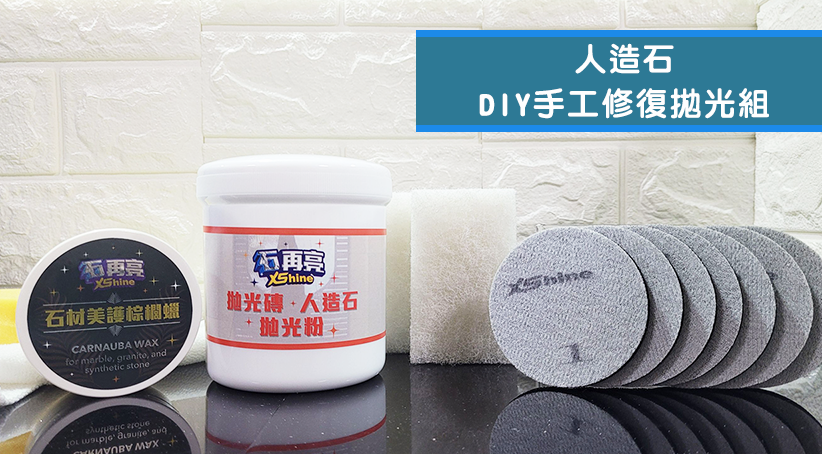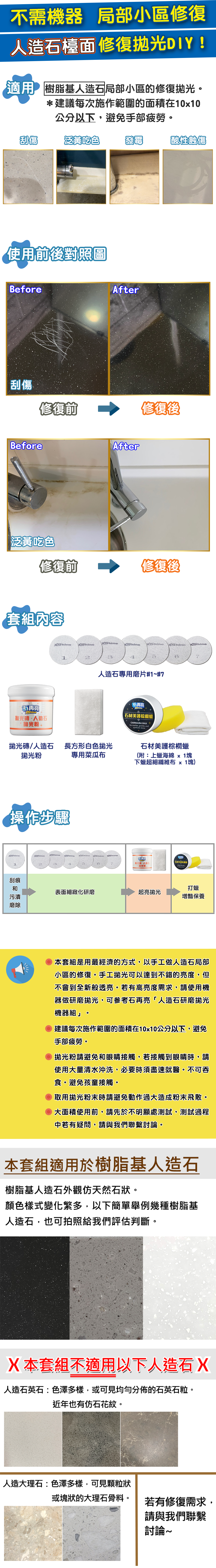 1. 本套組是用最經濟的方式,以手工做人造石局部小區的修復。手工拋光可以達到不錯的亮度,但不會到全新般透亮。若有高亮度需求,請使用機器做研磨拋光,可參考石再亮「人造石研磨拋光機器組」。
