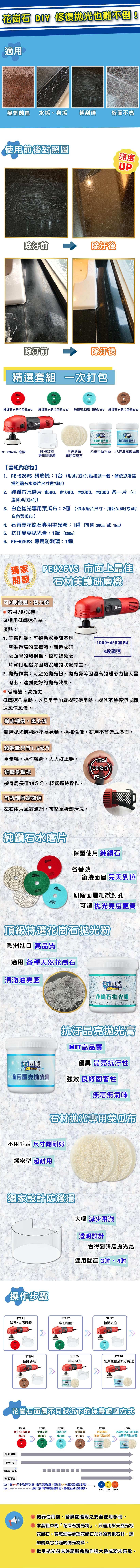 2. 本套組中的「花崗石拋光粉」,只適用於天然光板花崗石。若您需要處理花崗石以外的其他石材,請加購其它合適的拋光材料。