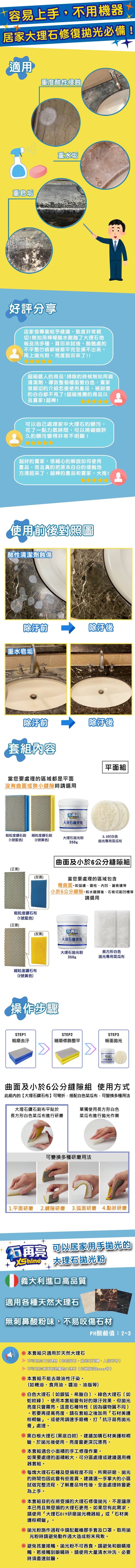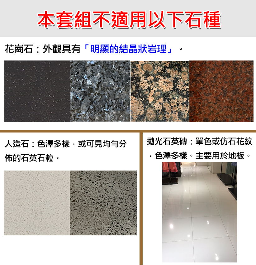 *本套組不能去除大理石面層嚴重刮線及凹洞破損,亦不適用油性汙染(如機油、食用油、醬油、油脂等)的去除。