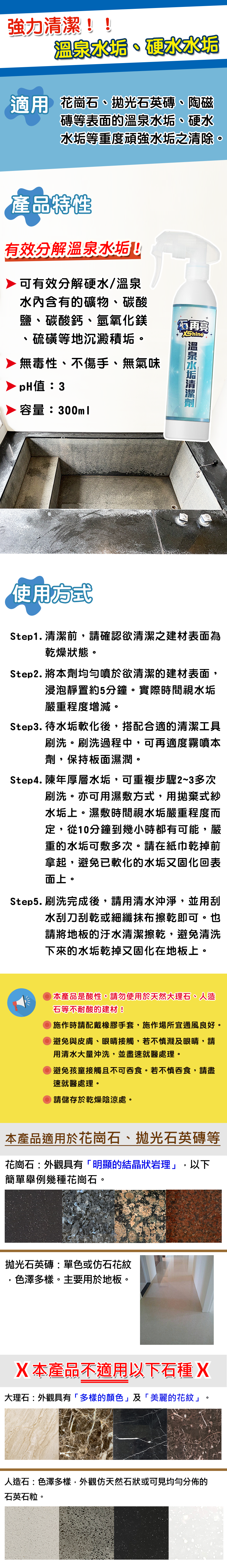 ✨適用花崗石、拋光石英磚、陶磁磚等表面的溫泉水垢、硬水水垢等重度頑強水垢之清除