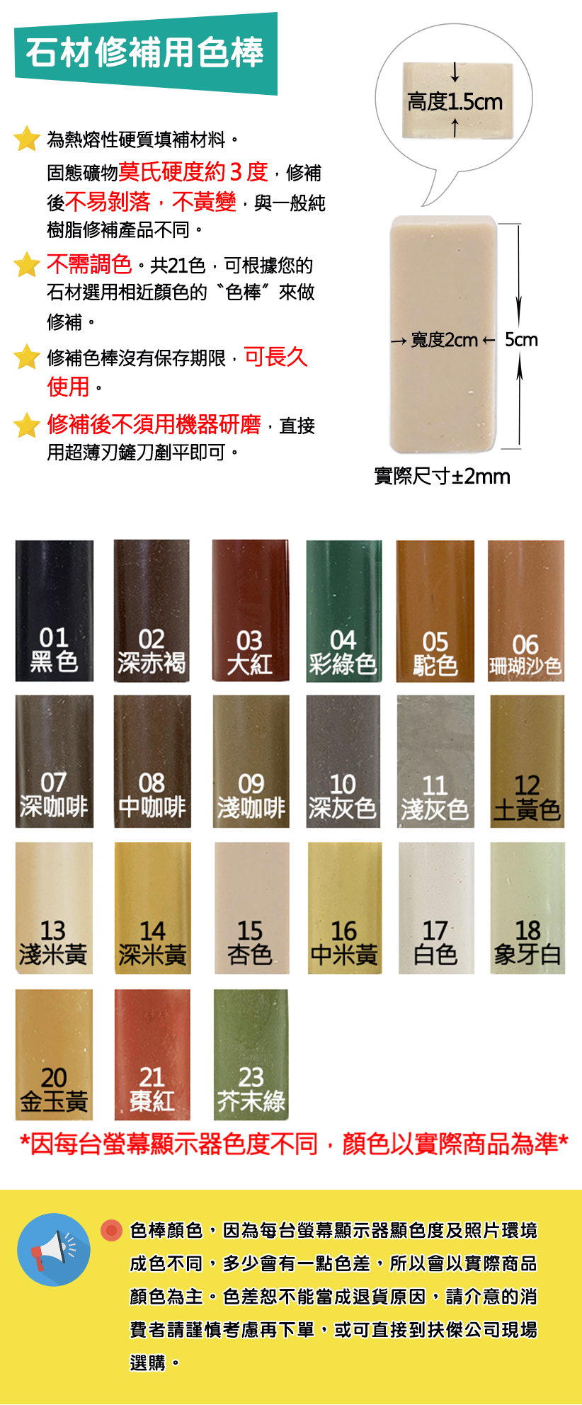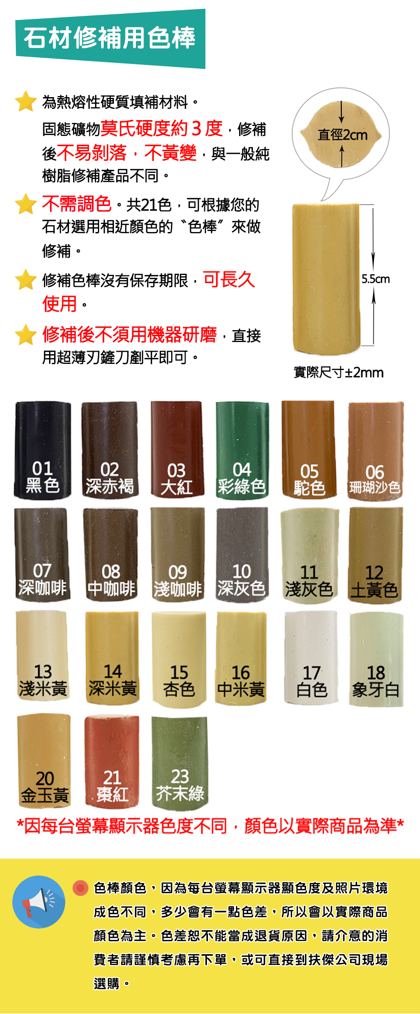 2. 不需調色。共21色,可根據您的石材選用相近顏色的〝色棒〞來做修補。